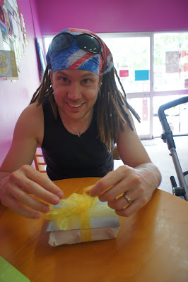 Hubs did very very well, and I think I did pretty well with his prezzie too. I wanted to buy him a leather belt, as leather is the symbol for the 3rd wedding anniversary (according to some). Of course the wrapping is part of the fun of gift-giving: