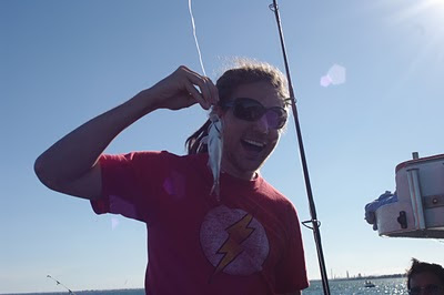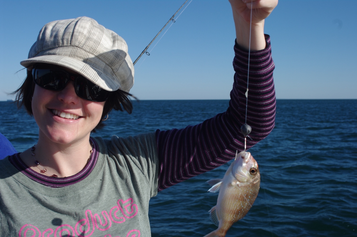 It was such a beautiful day – bright blue sunshine! – but it was quite windy, so Wayne headed for more sheltered waters, and we cast our lines and waited. We didn’t have to wait long before we got some bites, and Beth caught the fist fish of the day – a pink snapper, or “pinkie” as they call them. Though, she wasn’t so impressed with getting up close and personal!