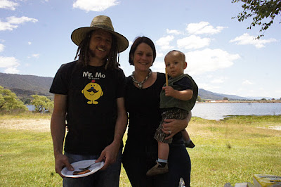 First up we have Wifey, wearing her red dress she recently purchased on line, accessorising with a Mimco necklace given to her by her darling Hubsband as an annivchrisbirthday present. Chanbe’s outfit was purchased at the local op-shop for a total of $2, with accessories made with love from 8-10pm last night by his Mama, with the help of his Dadda and Ouma. Hubs is looking dashing in his pinstripe pants that he wore on the day he made his vows to Wifey, matched with a lovely white paisley shirt and topped off with black suspenders. And Ma is wearing a delightful silk dress she picked up whilst in Melbourne last week, paired with a stunning cardi and super-cute fascinator.