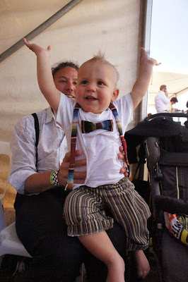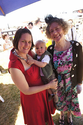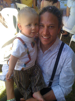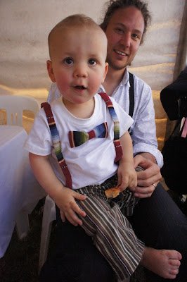 First up we have Wifey, wearing her red dress she recently purchased on line, accessorising with a Mimco necklace given to her by her darling Hubsband as an annivchrisbirthday present. Chanbe’s outfit was purchased at the local op-shop for a total of $2, with accessories made with love from 8-10pm last night by his Mama, with the help of his Dadda and Ouma. Hubs is looking dashing in his pinstripe pants that he wore on the day he made his vows to Wifey, matched with a lovely white paisley shirt and topped off with black suspenders. And Ma is wearing a delightful silk dress she picked up whilst in Melbourne last week, paired with a stunning cardi and super-cute fascinator.