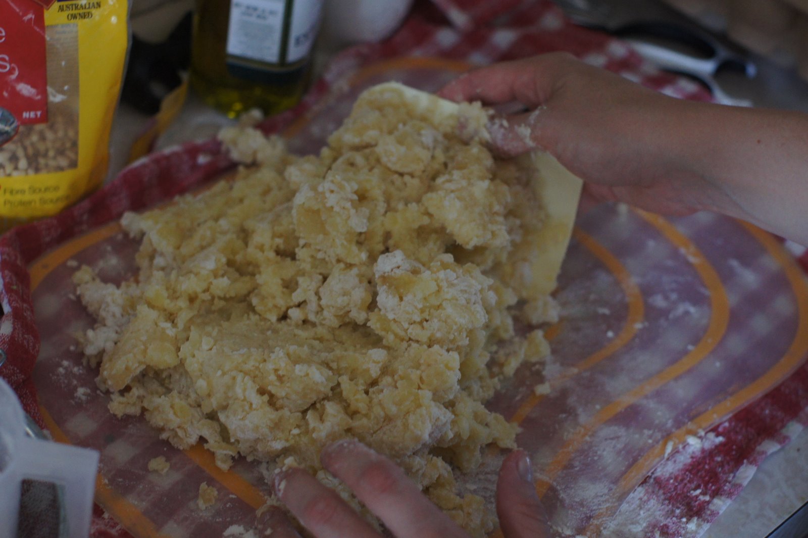 Here’s what to do: I followed this recipe pretty much word for word. Start by boiling the potatoes whole with the skins on, peel them and scrape/mash them with a fork.